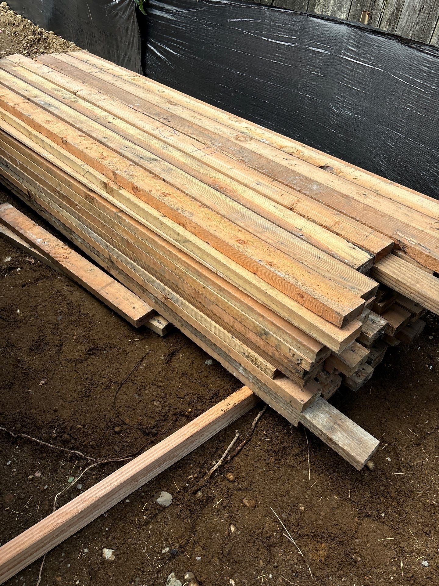 Lumber recovered from Seattle area buildings. Most of the metal hardware has been removed.