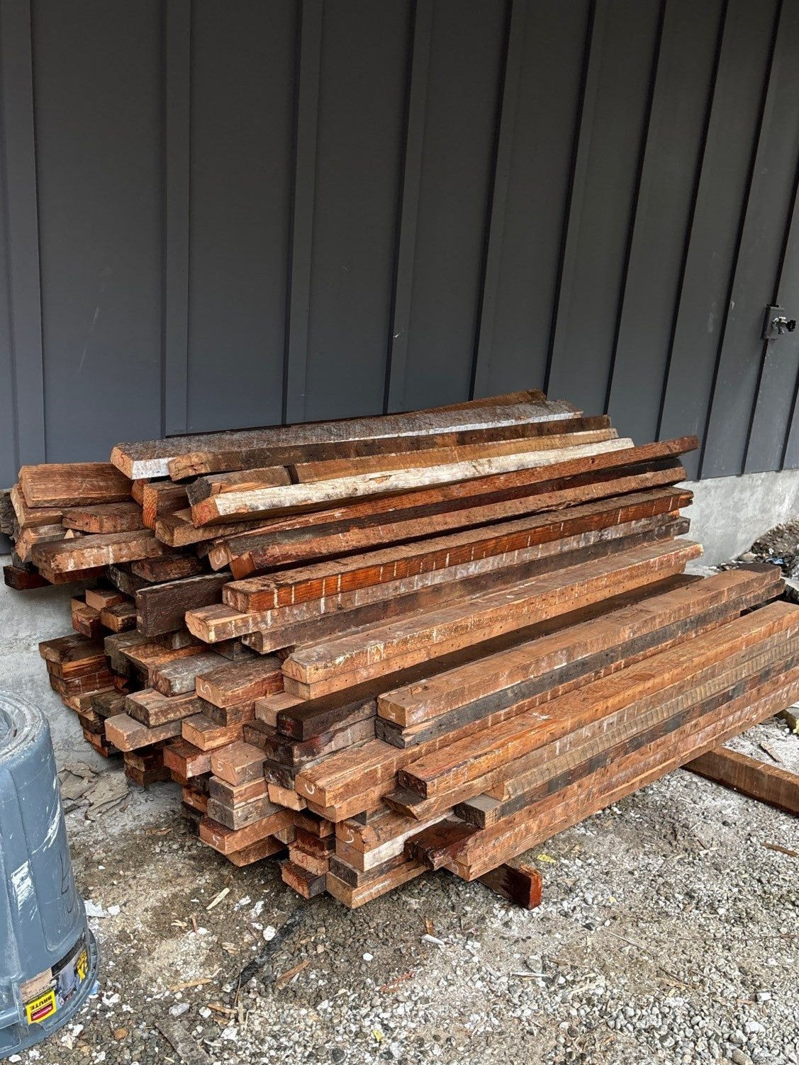 Lumber recovered from Seattle area buildings. Most of the metal hardware has been removed.